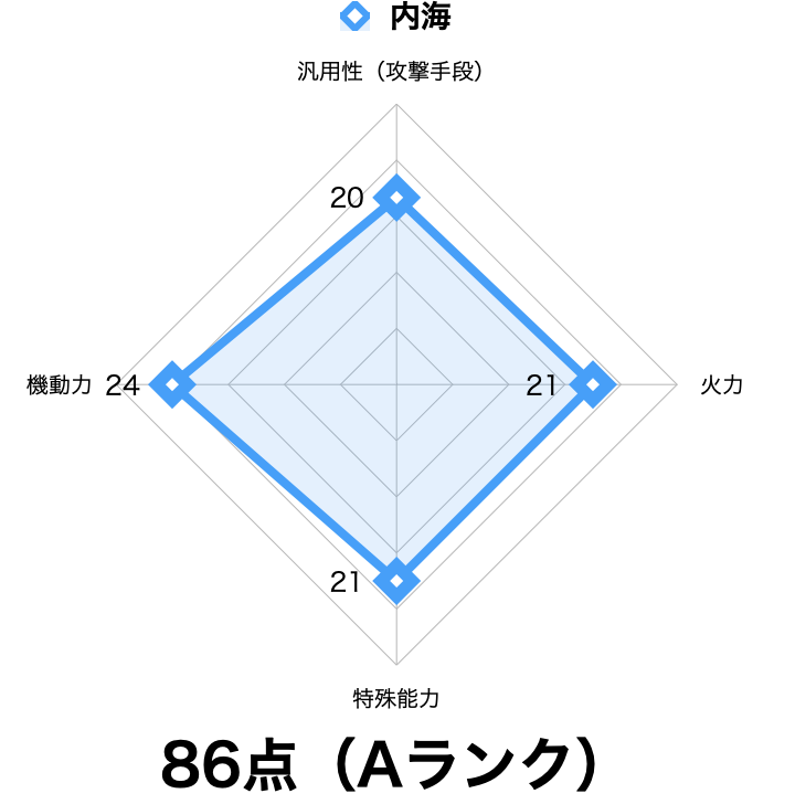 ただし、いずれの攻撃手段も決定力には欠ける印象であり、特に武器に関しては初期フォームの物も含まれている点を踏まえると手放しに最高評価とはしにくいです。ここでは20点とします。
