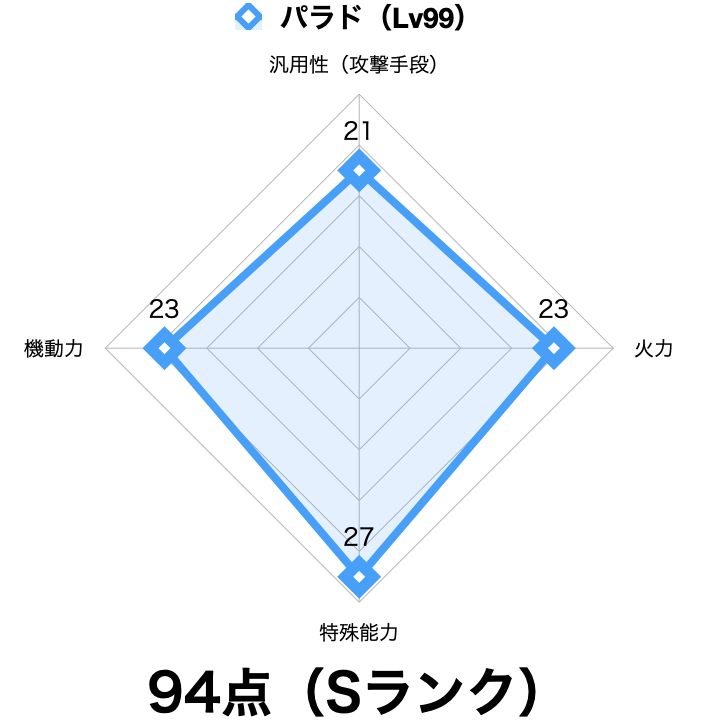 「マッスル化」による火力アップは特殊能力の項目で考慮する事とし、この項目は「高い実数値」「貫通ダメージ」の2要素から23点とします。